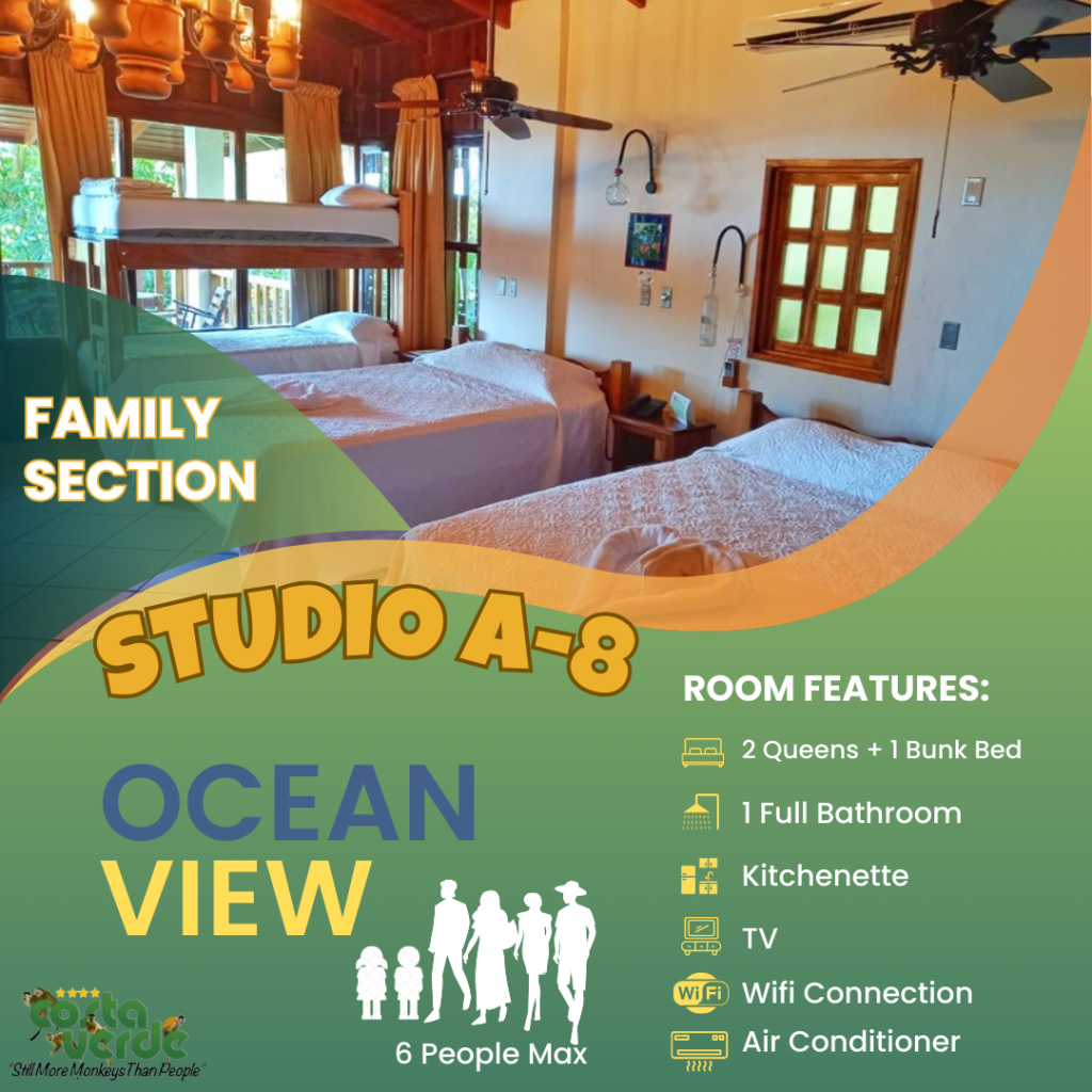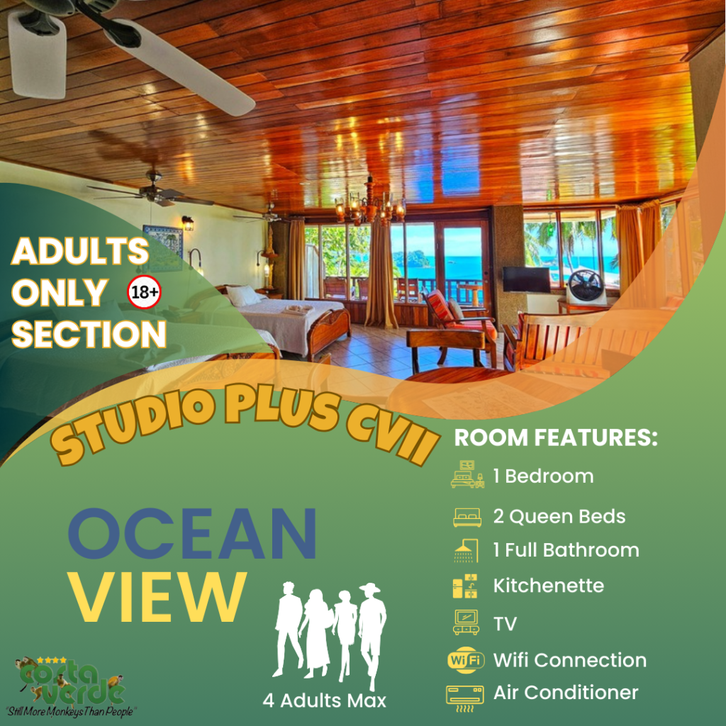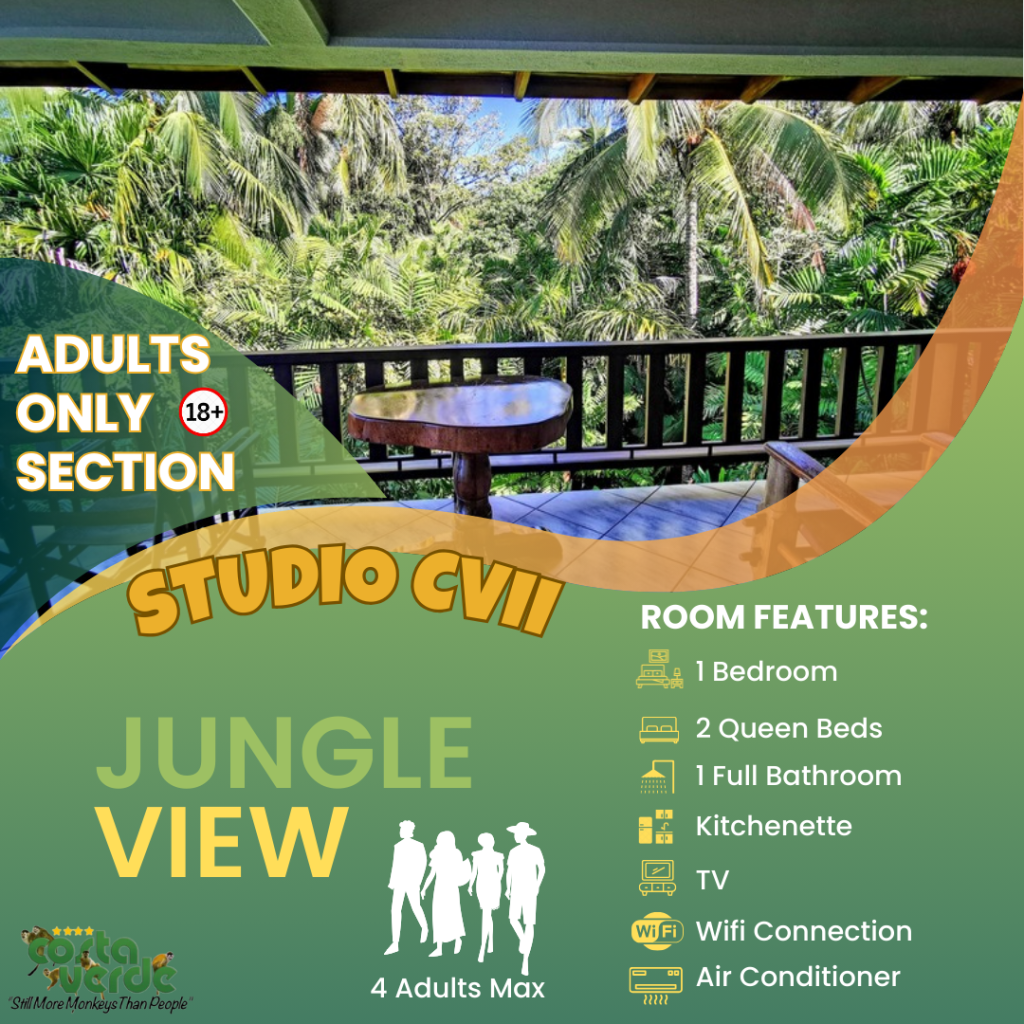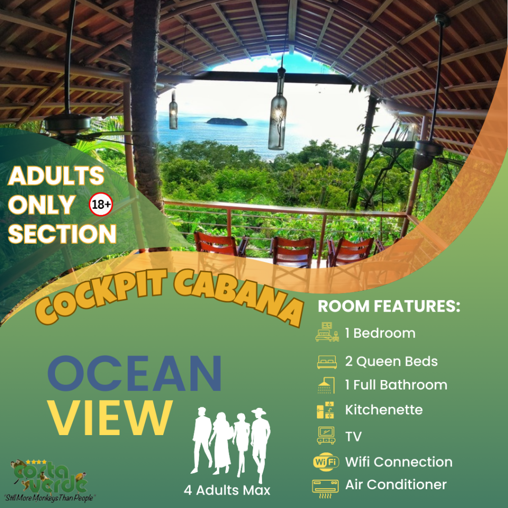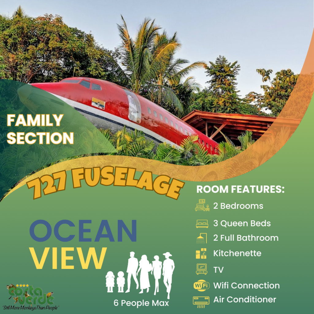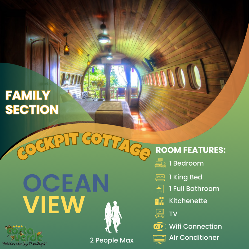 En Costa Verde, la mayoría de nuestras habitaciones son del tipo estudio, es decir, una sola habitación que incluye camas y cocina en un solo espacio. Todas están equipadas con kitchenette, baño privado con agua caliente y aire acondicionado. También contamos con bungalows más amplios para mayor comodidad. En el sector solo para adultos, ofrecemos más estudios con vistas impresionantes a la selva y al mar. Además, tenemos cuatro aviones restaurados y convertidos en suites exclusivas para una experiencia única.