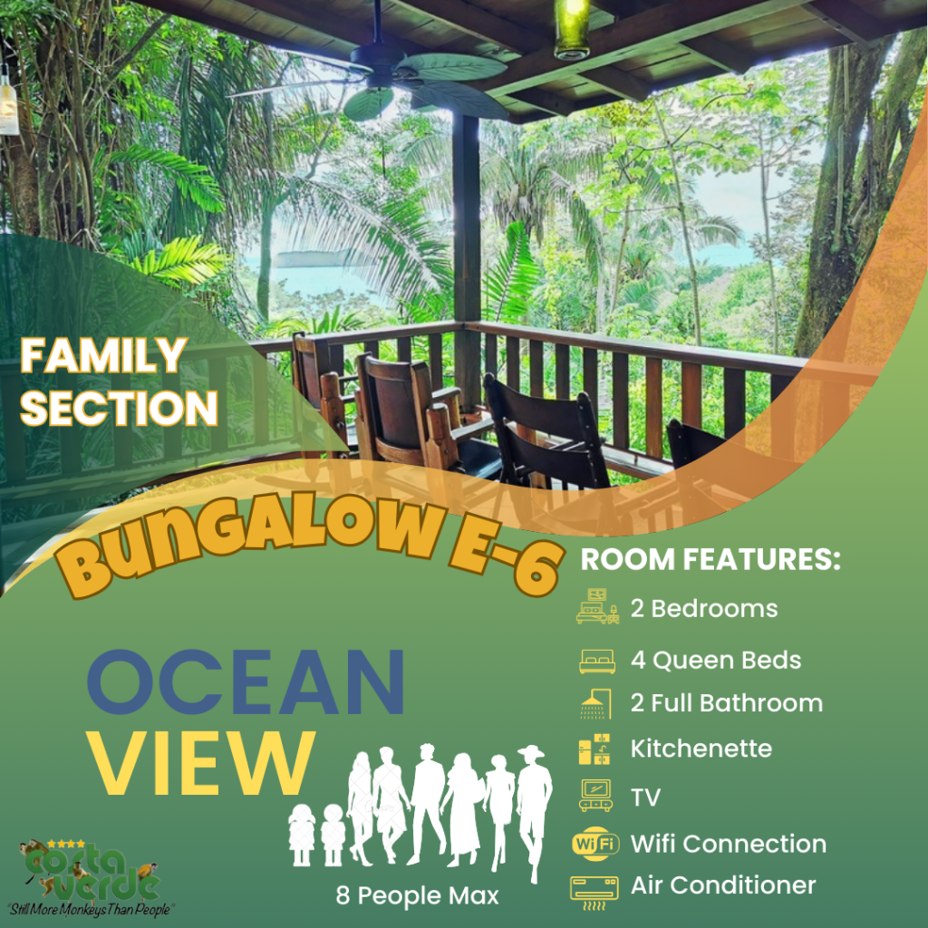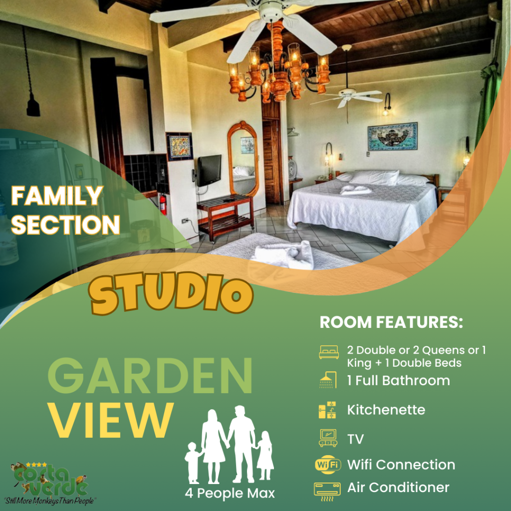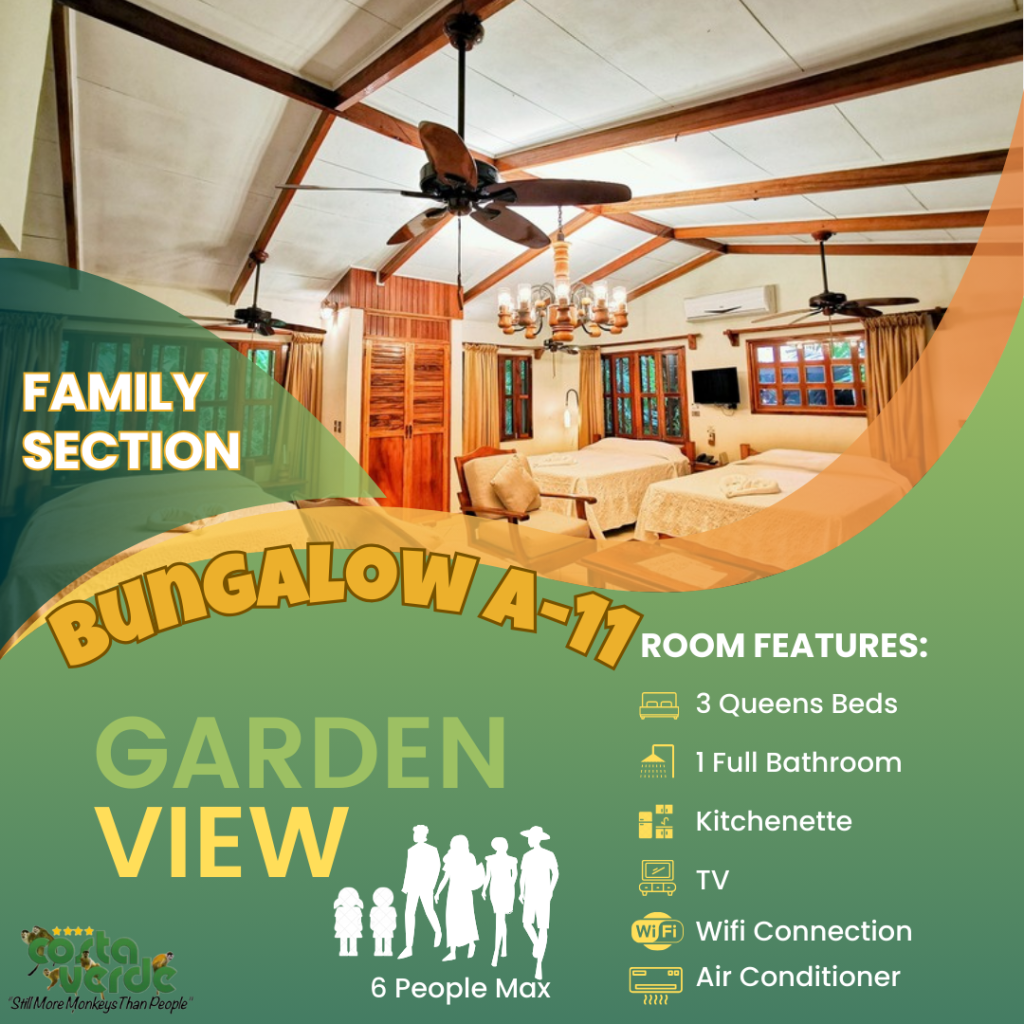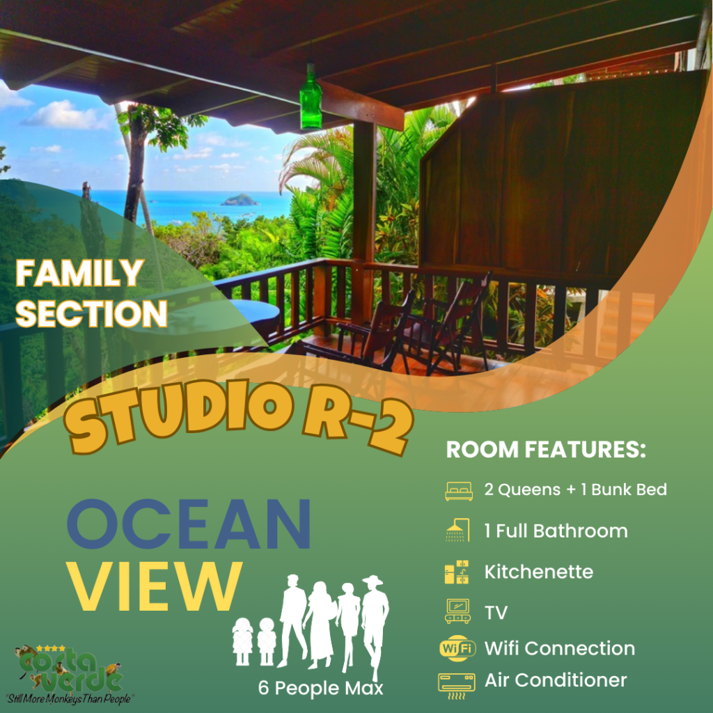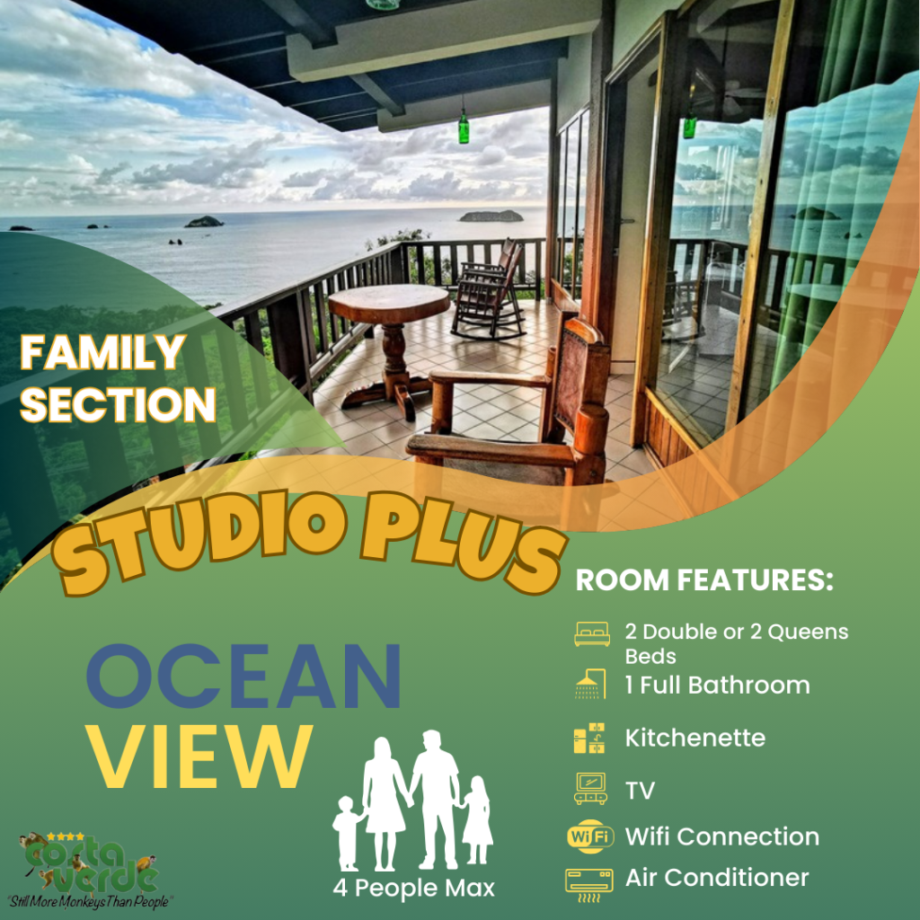 En Costa Verde, la mayoría de nuestras habitaciones son del tipo estudio, es decir, una sola habitación que incluye camas y cocina en un solo espacio. Todas están equipadas con kitchenette, baño privado con agua caliente y aire acondicionado. También contamos con bungalows más amplios para mayor comodidad. En el sector solo para adultos, ofrecemos más estudios con vistas impresionantes a la selva y al mar. Además, tenemos cuatro aviones restaurados y convertidos en suites exclusivas para una experiencia única.