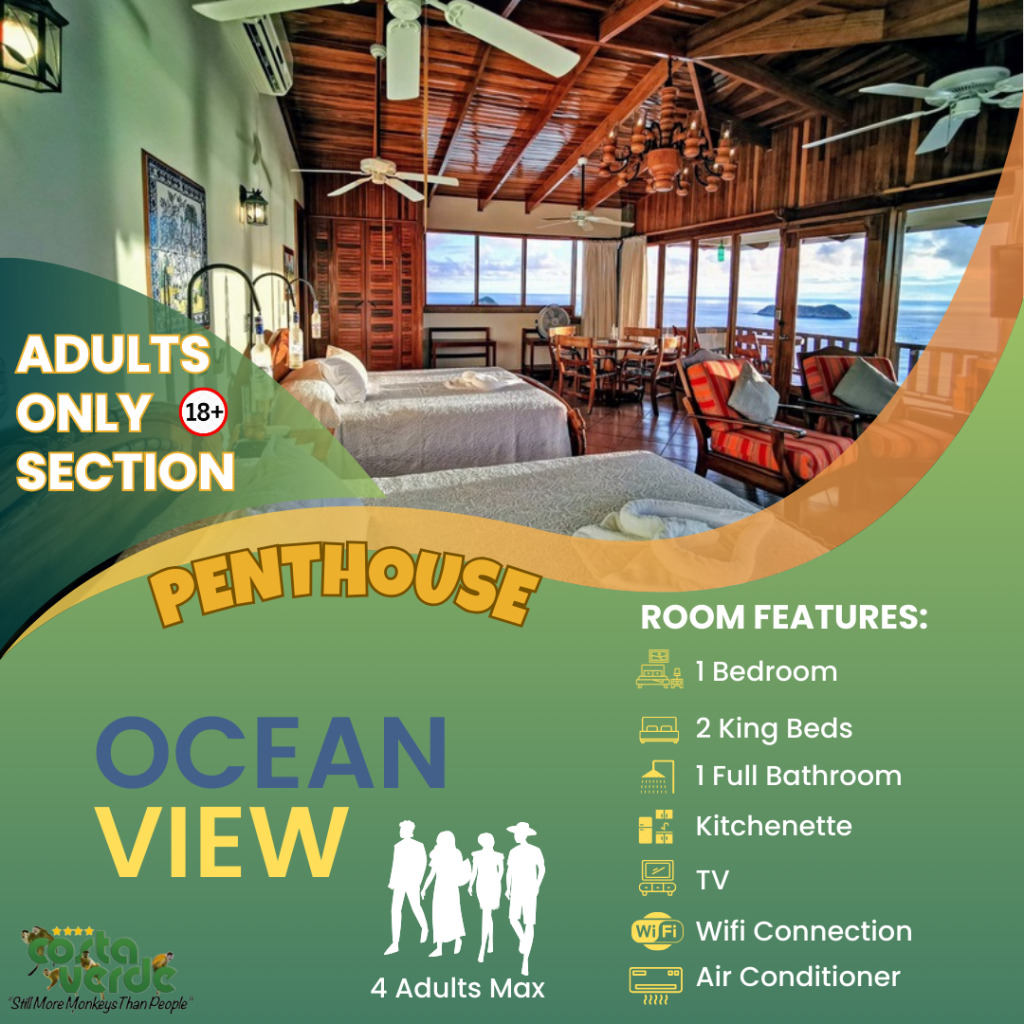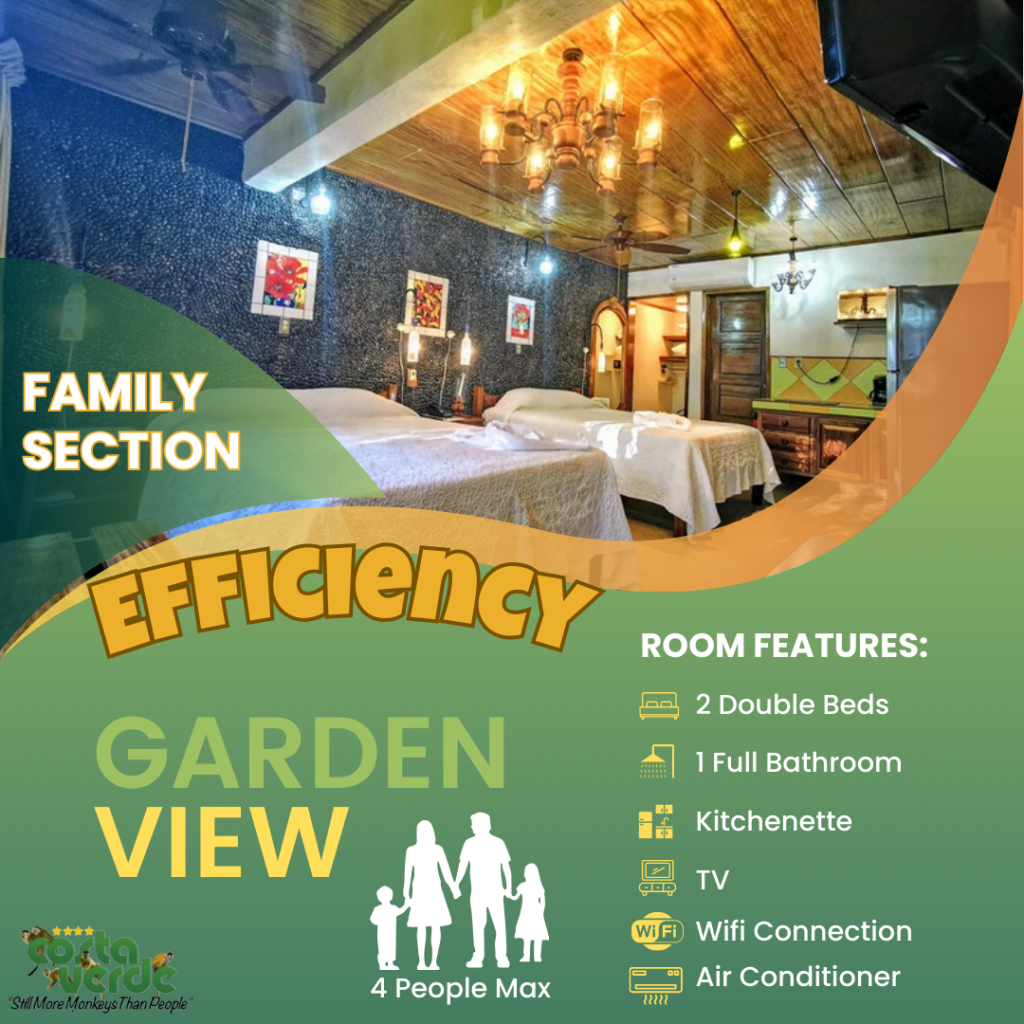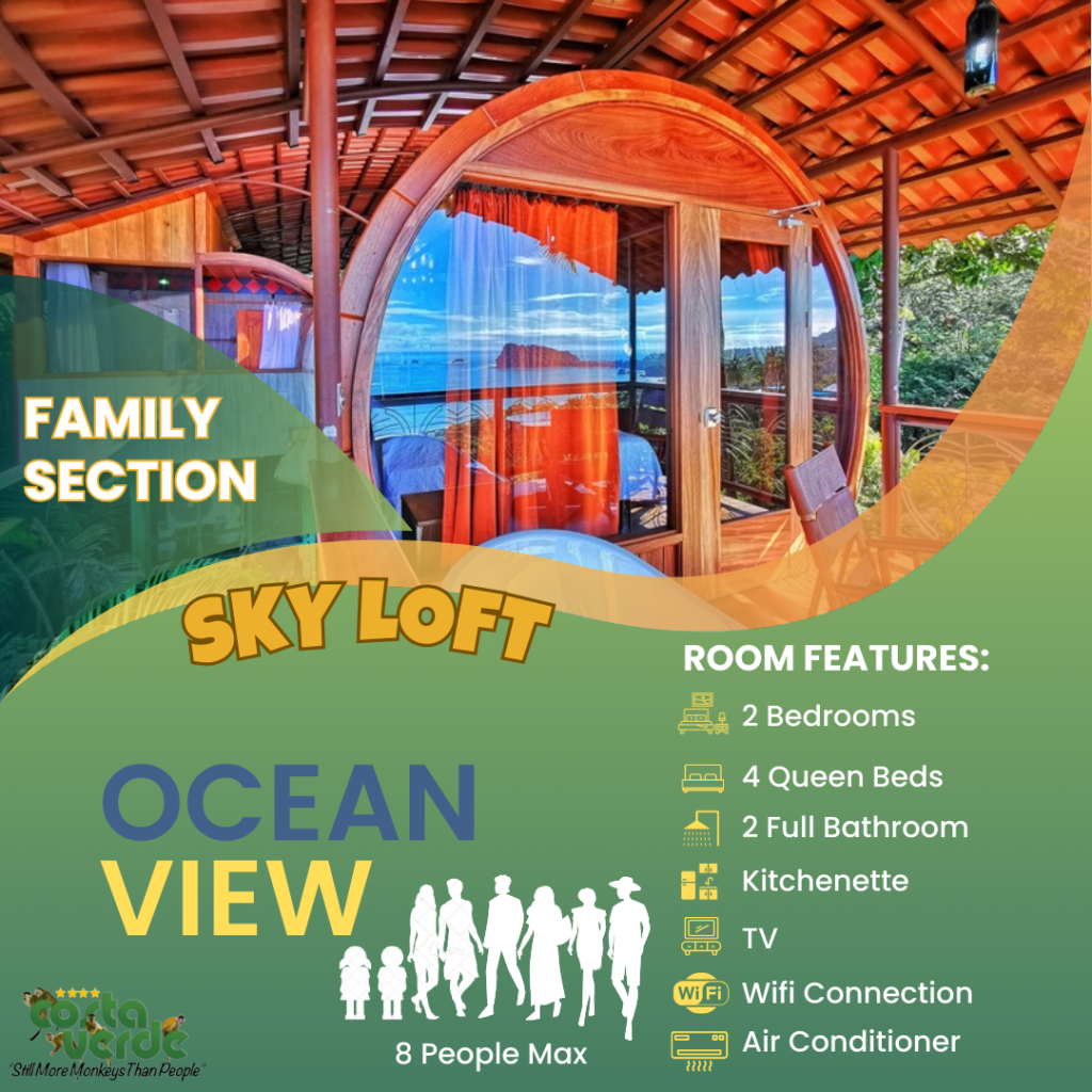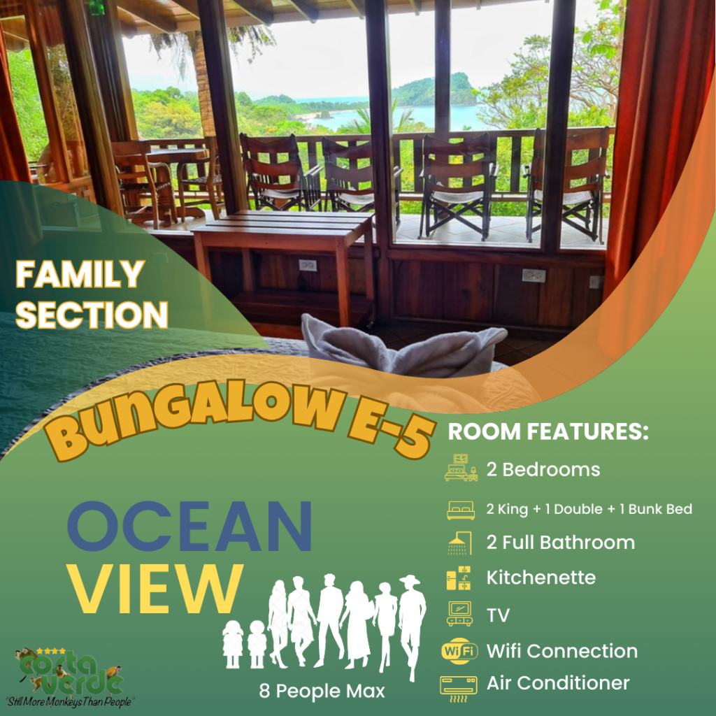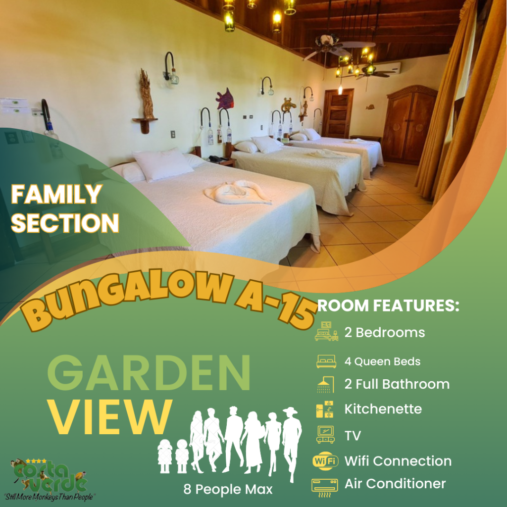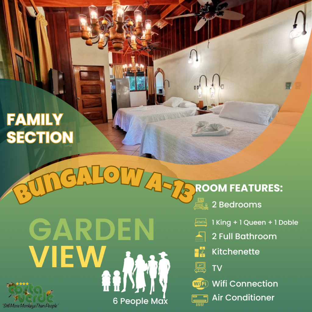 En Costa Verde, la mayoría de nuestras habitaciones son del tipo estudio, es decir, una sola habitación que incluye camas y cocina en un solo espacio. Todas están equipadas con kitchenette, baño privado con agua caliente y aire acondicionado. También contamos con bungalows más amplios para mayor comodidad. En el sector solo para adultos, ofrecemos más estudios con vistas impresionantes a la selva y al mar. Además, tenemos cuatro aviones restaurados y convertidos en suites exclusivas para una experiencia única.